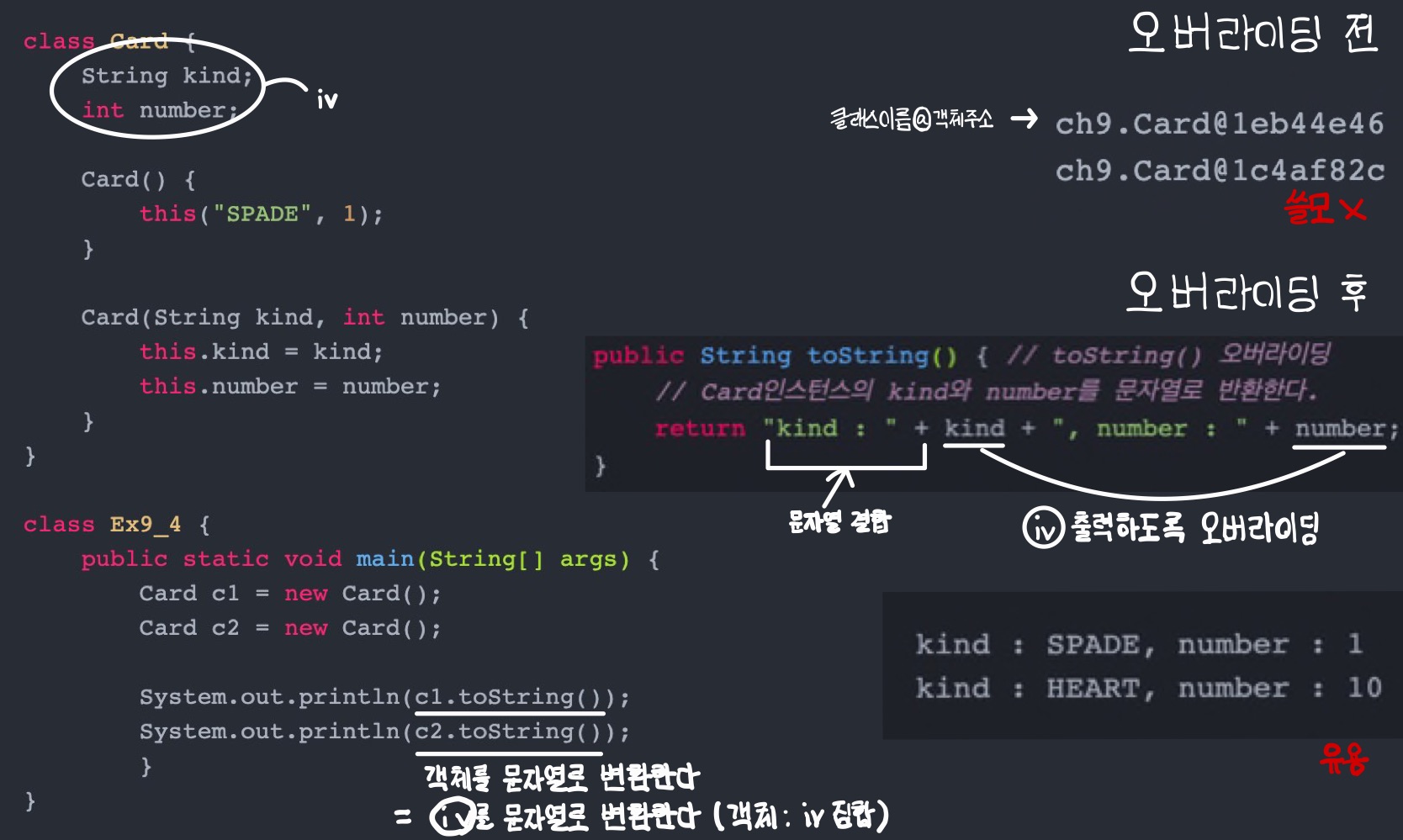 객체를 문자열로 변환한다는 것은 'iv'를 문자열로 변환한다는 것과 같다. (객체 : iv 집합이기 때문)