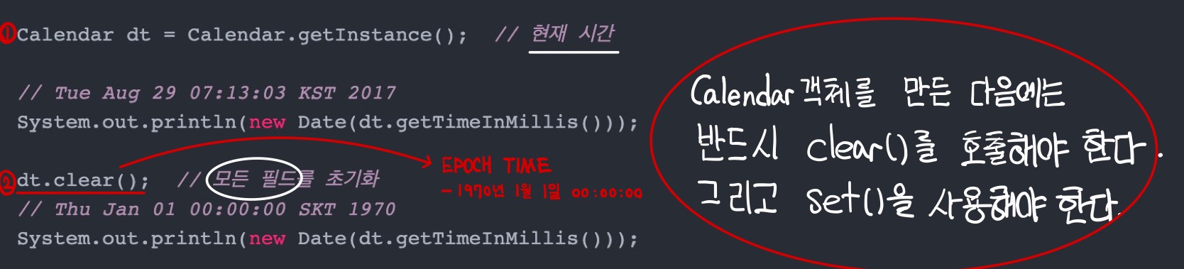 - clear(int field)는 Calendar객체의 특정 필드를 초기화