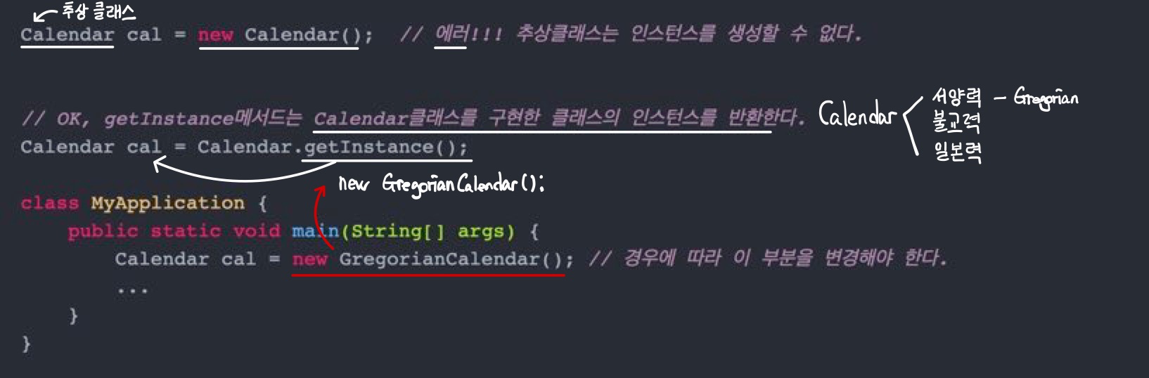 - 추상 클래스이므로 getInstance()를 통해 구현된 객체를 얻어야 한다.