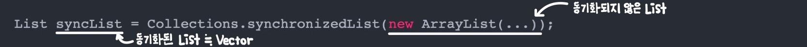 동기화되지 않은 List를 인자로 넣어 synchronizedList메서드를 호출하면 동기화된 List를 얻을 수 있다. 그 이후 List를 사용하면 된다. 동기화된 List는 Vector를 사용하는 것과 똑같은 결과를 얻게 된다.