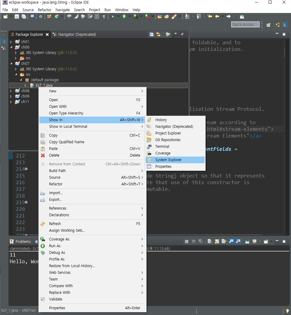 소스파일 위치 탐색 : 파일 우클릭 > Show In > System Explorer