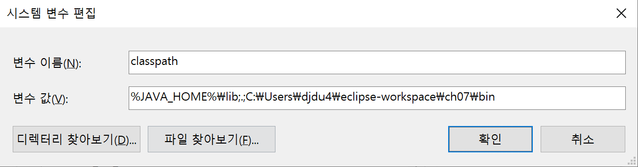 C:\Users\djdu4>set classpath=C:\jdk-11.0.2\lib;C:\Users\djdu4\eclipse-workspace\ch07\bin