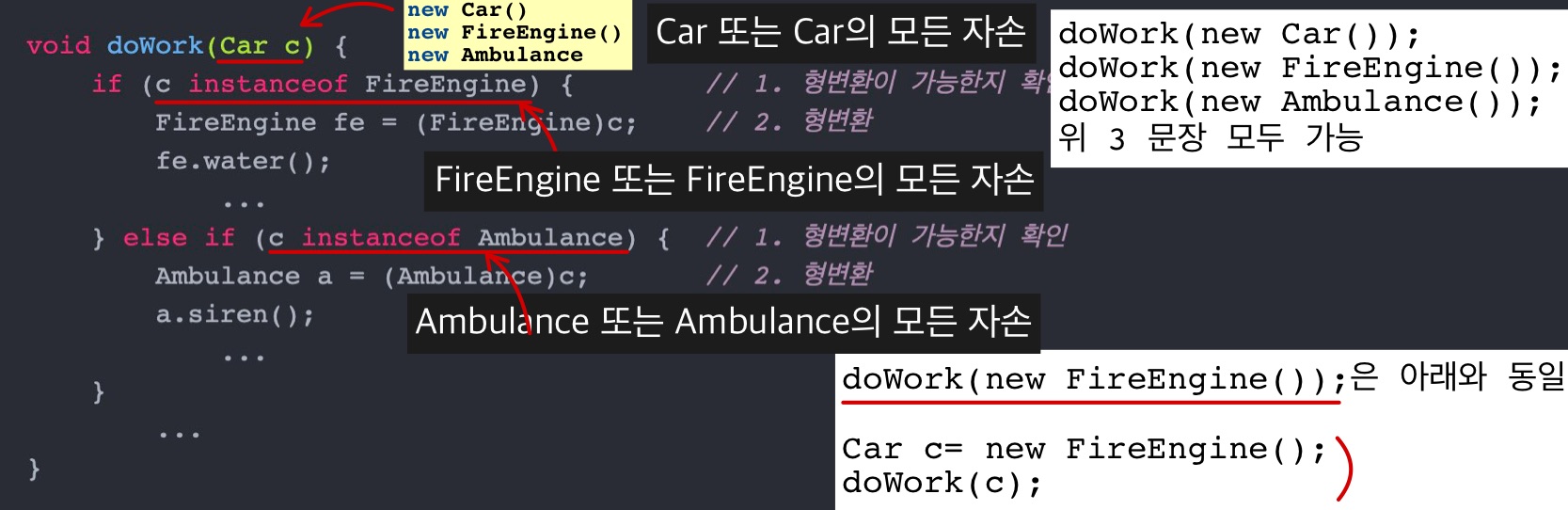 - 메서드가 호출될 때, 매개변수로 Car클래스 또는 그 자손 클래스의 인스턴스를 넘겨받겠지만 어떤 인스턴스인지 알 길이 없다.