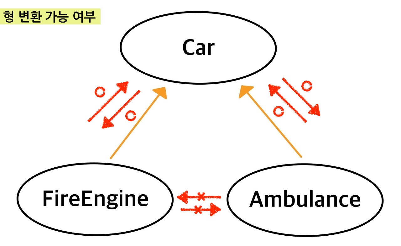 FireEngine fe = (FireEngine)car; // 형변환 런타임 에러. java.lang.ClassCastException