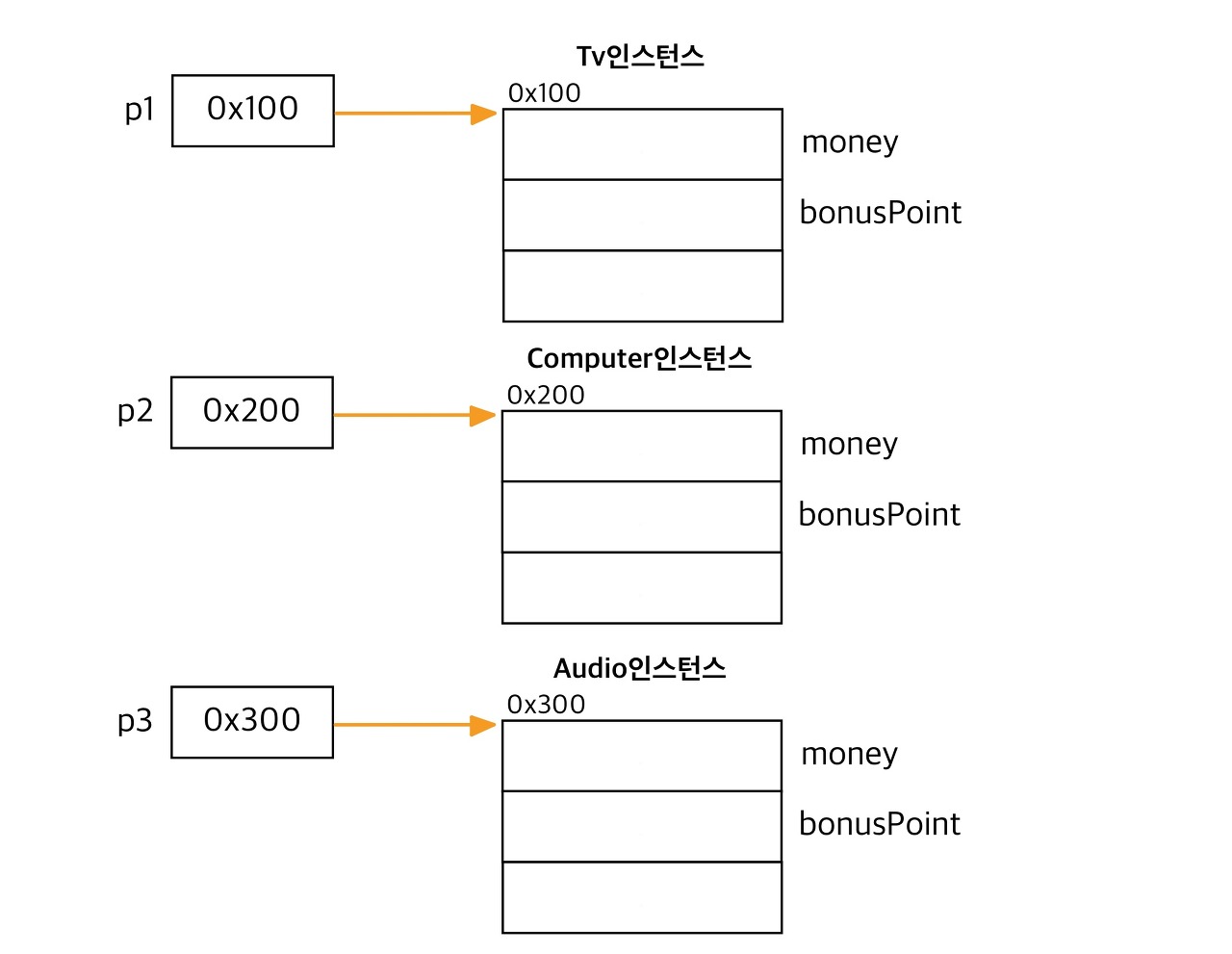 - 다형적 매개변수 :참조형 매개변수는 메서드 호출 시, 자신과 같은 타입 또는 자손타입의 인스턴스를 넘겨줄 수 있다.