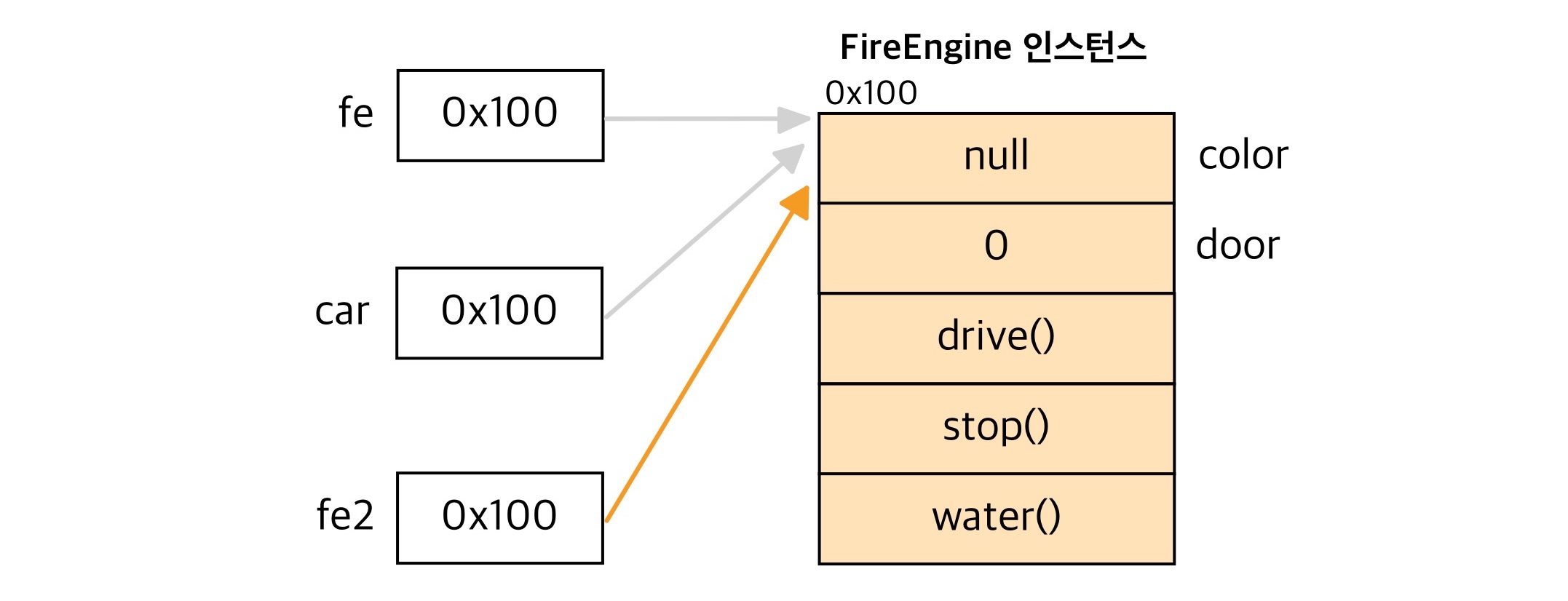 - Car타입의 리모컨인 c로는 water()를 호출할 수 없기 때문에 리모컨을 FireEngine타입으로 바꿔서 water()를 호출한다.