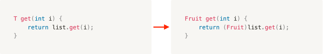 FruitBox<Apple> appleBox = (FruitBox<Apple>)abox; // OK. 경고발생 - 형변환 생략불가
