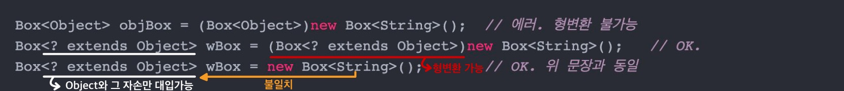 bStr = (Box<String>)b; // Box -> Box<String> 가능 but 경고