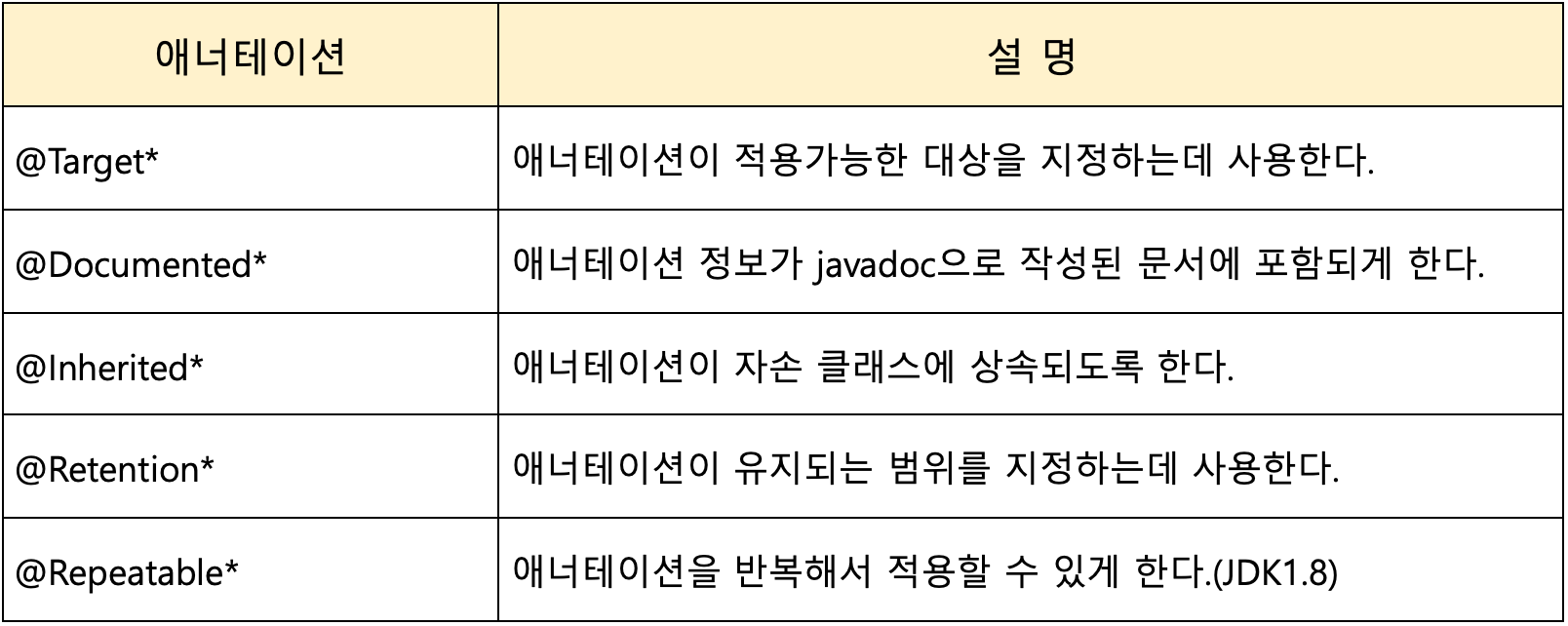 - 메타 애너테이션은 '애너테이션을 위한 애너테이션'