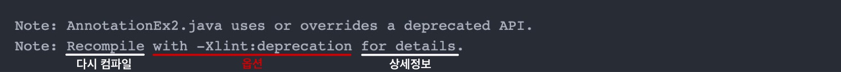 - @Deprecated가 붙은 대상이 사용된 코드를 컴파일하면 나타나는 메시지