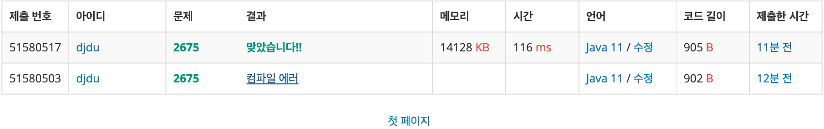 문자열 S의 변수를 선언할 때, 타입을 int로 해서 컴파일 에러가 발생했다. String으로 수정했다.