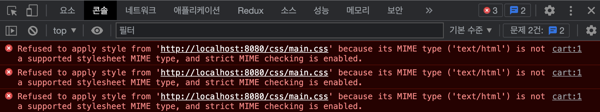 해석하면, 'main.css'라는 스타일시트 파일을 적용할 수 없다는 뜻이다.