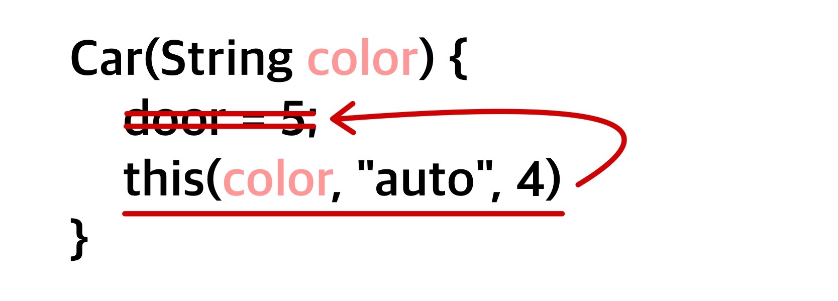 this("white", "auto", 4); // Car(String color, String gearType, int door)호출