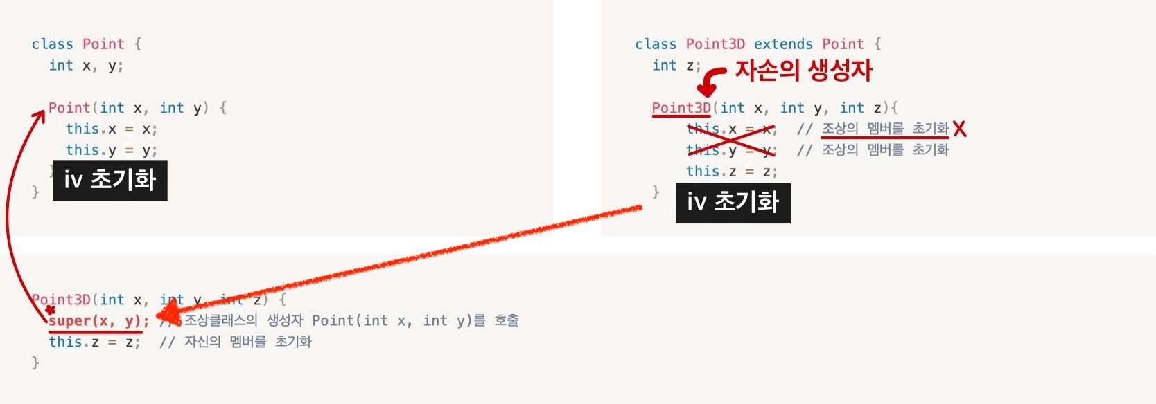- 조상의 멤버는 조상의 생성자를 호출해서 초기화(생성자, 초기화 블럭 제외)
