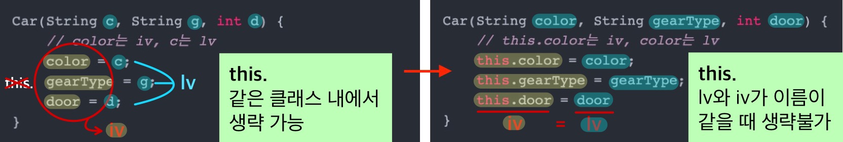 - 지역변수(lv)와 인스턴스변수(iv)를 구별할 때 this 사용