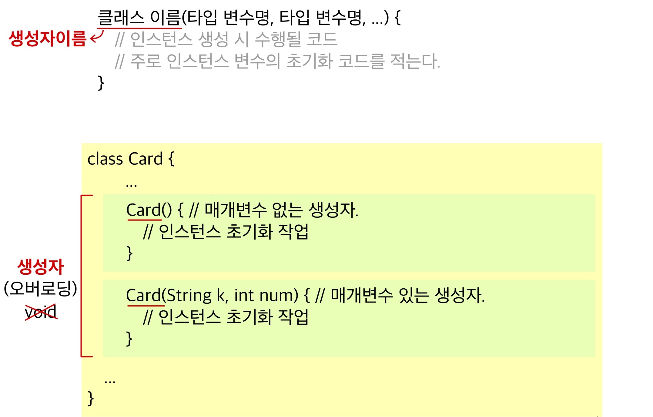 - Card()는 기본 생성자라 하는 것인데, 생성자가 하나도 없을 때 컴파일러가 자동으로 추가해준다.