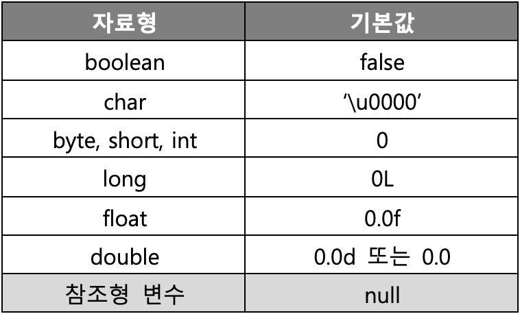 - 멤버변수(iv, cv)와 배열은 각 타입의 기본값으로 ‘자동 초기화’ 된다.