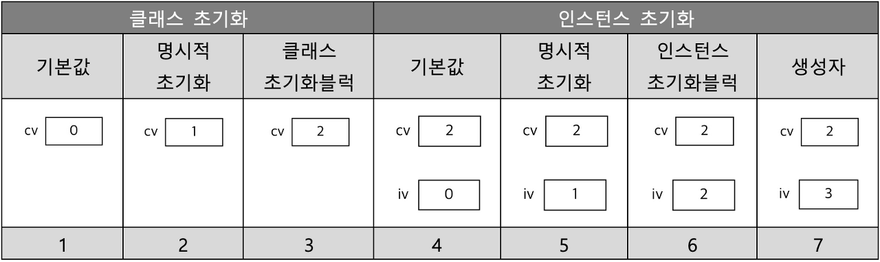 - ① 클래스 변수(cv) 초기화 → 인스턴스 변수(iv) 초기화