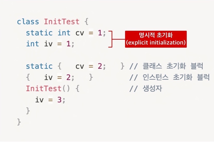 - ② 자동 초기화 → 명시적 초기화(간단, =) → 초기화 블럭 || 생성자(복잡, 여러 문장 넣기)