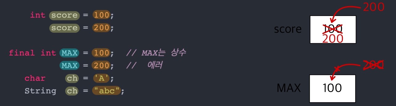 변수와 마찬가지로 ‘값을 저장할 수 있는 공간'이지만, 변수와 달리 한 번 값을 저장하면 다른 값으로 변경할 수 없다.