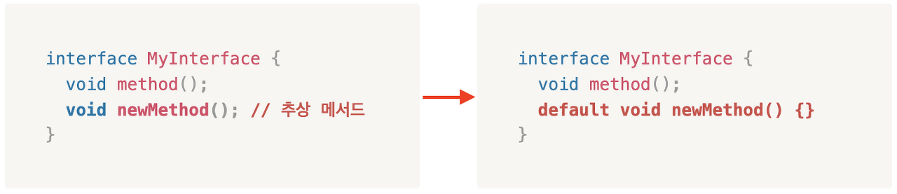 - 해결책 → 디폴트 메서드(default method)