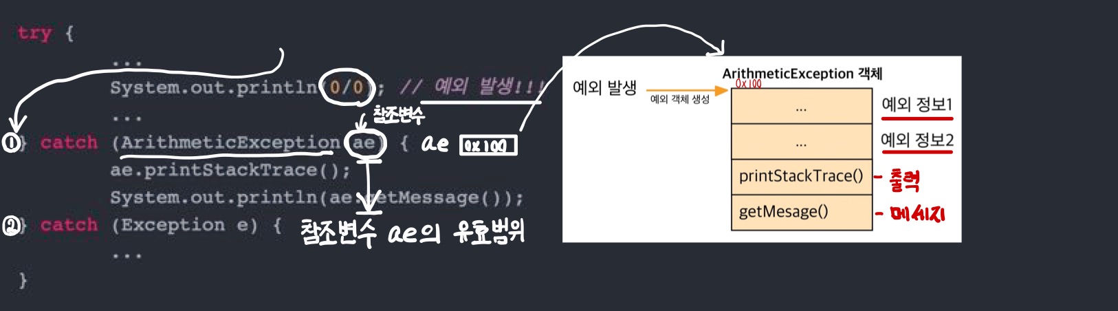 catch블럭의 괄호()에 선언된 참조변수를 통해 이 인스턴스에 접근할 수 있다. 이 참조변수는 선언된 catch블럭 내에서만 사용 가능하며, 자주 사용되는 메서드는 다음과 같다.